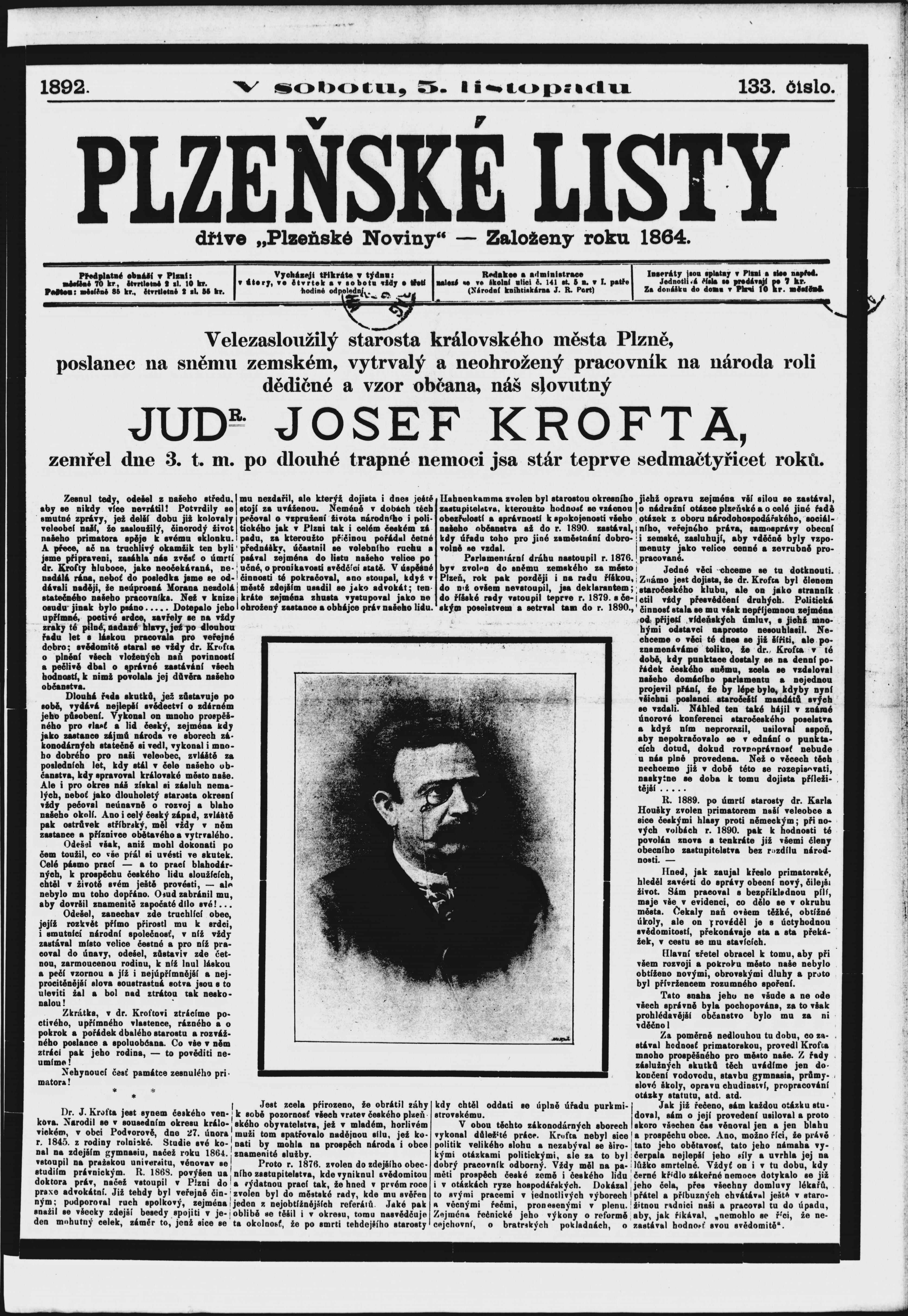 Úvodní strana Plzeňských listů oznamující úmrtí Josefa Krofty.
